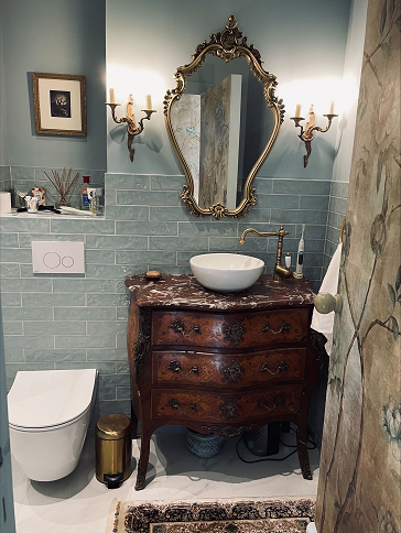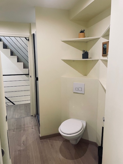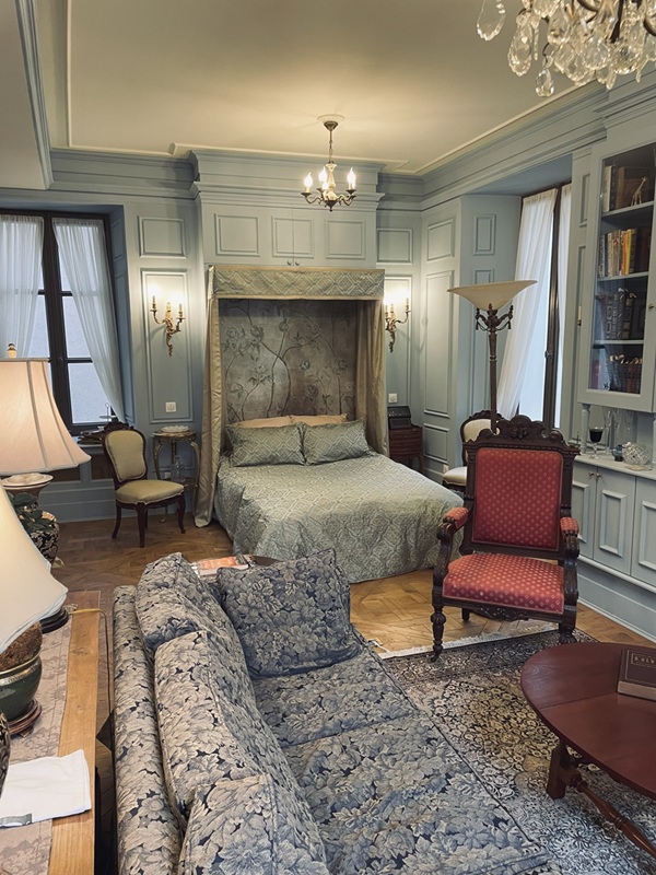 This apartment is a studio with Louis XV ambience, around 1750. In a hidden room you’ll find a small separate kitchen, fully-equipped including dishwasher. This level has many antique furnishings, mirrors, original art, silk carpets, and a crystal chandelier. The floor is parquet de Versailles. Most books are in English, a few are in French. The wall bed will be open during your stay. €180 per night.