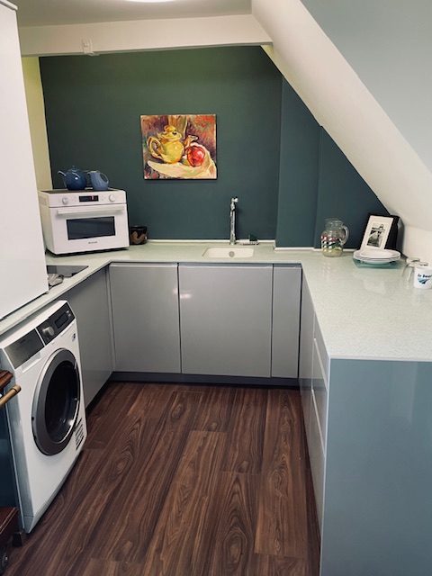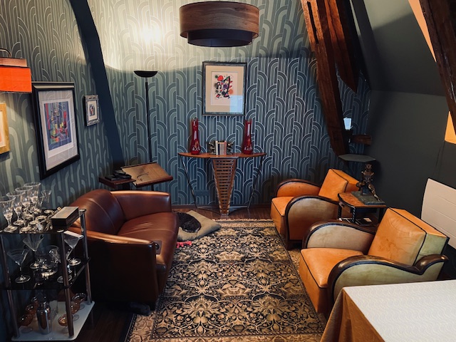 1930s ambience with a separate bedroom. This apartment has a fully-equipped kitchen, including dishwasher and a combination clothes washer / dryer. This space features original art, paintings, unique furnishings, and family heirlooms (for example, the four-poster bed belonged to my grandmother, whose portrait hangs opposite). There’s a large bathtub / shower combination. €168 per night.