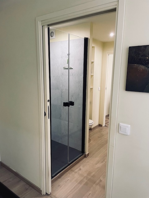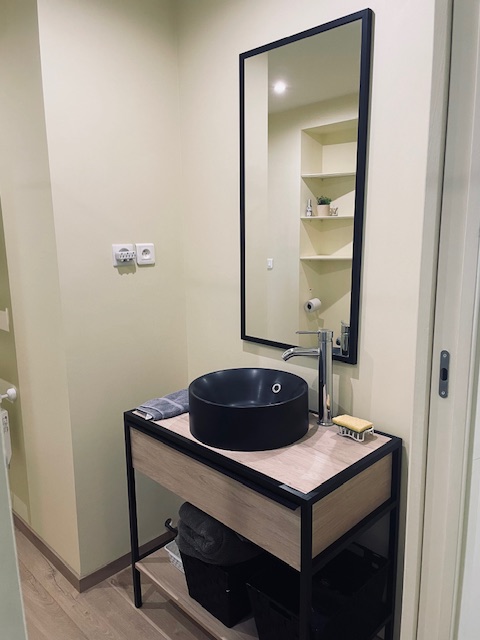 The guest house is an independent apartment across a small courtyard from the main building. You enter through a gate into the courtyard. The ground floor entry features seating and a place for coats. On the first floor are the bedroom and bathroom with shower. The top floor has a large kitchen, a comfortable living area, and dining area. About 60 square meters all together. €100 per night.